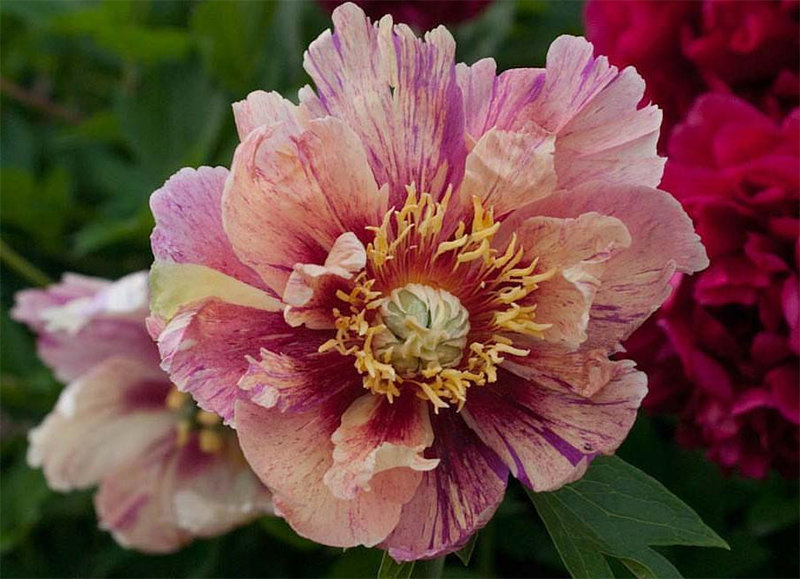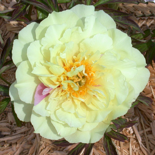 Цветлк махровый, желтый с ловандовым, на одном растении цветки желтые, лавандово желтые и чисто ловандовые. Диаметр цветка 18 см., высота куста 85 см. Листья плотные темно-зелёные. |