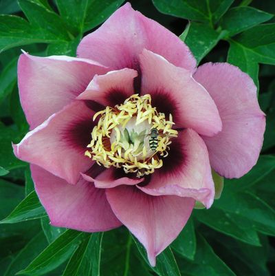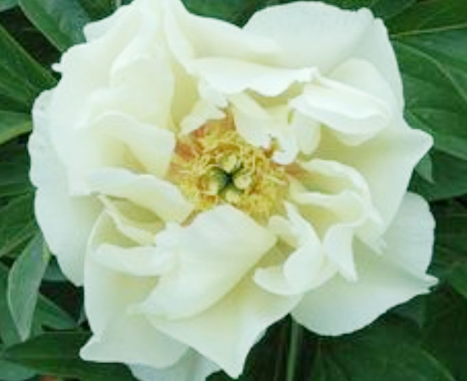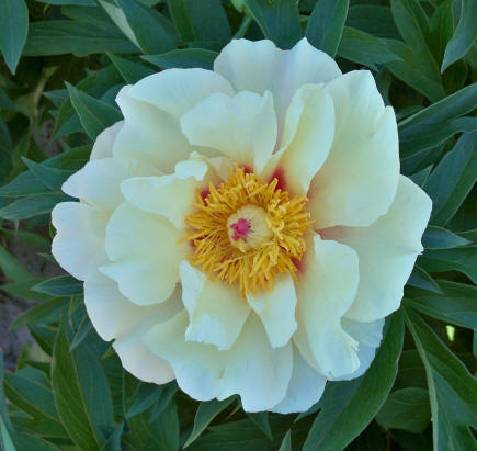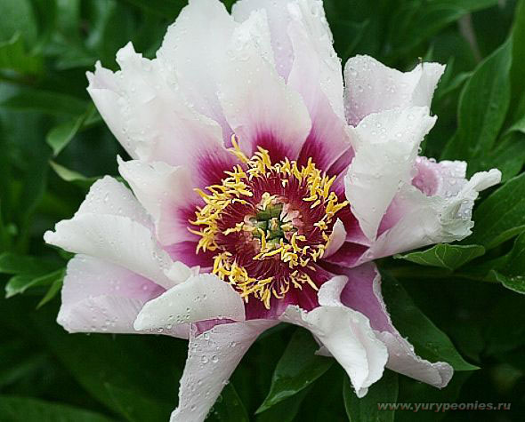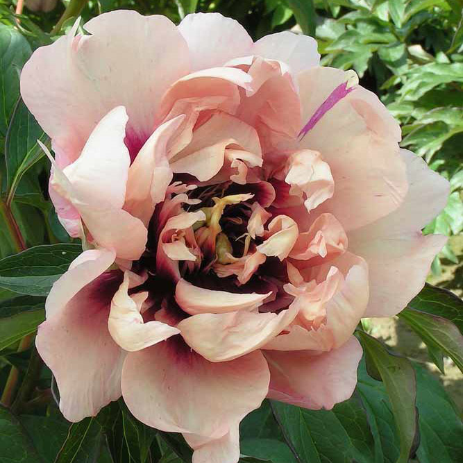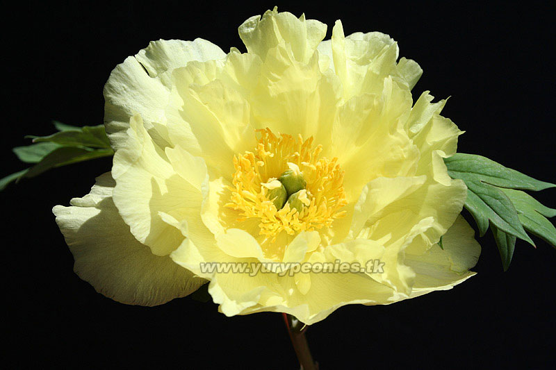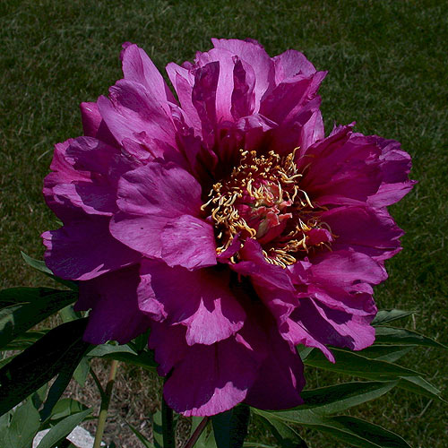 Цветок махровый, фиолетово-лиловый с ярко-желтыми тычынками в центре. Диаметр цветка 20 см, высота растения 85 см. Куст ровный, цветоносы очень прочные, цветы возвышаются высоко над ккустом. Листья плотные, темно-зеленые.