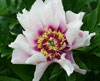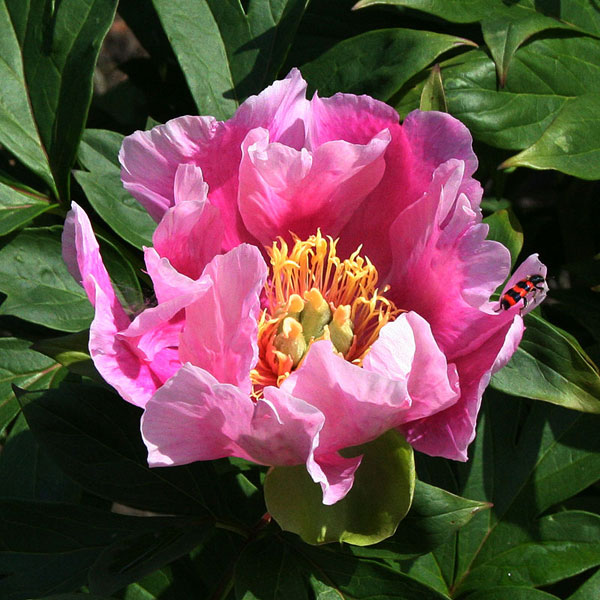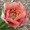 Цветок полумахровый, караллово-розовый, в основании цветка красно-малиновое пятно. Диаметр цветка 18-20 см., высота куста 80 см. Листья зеленые, плотные.