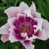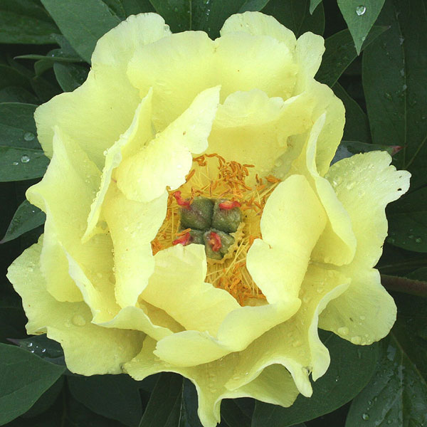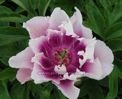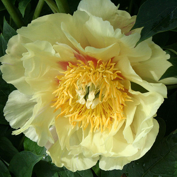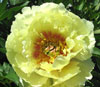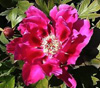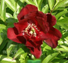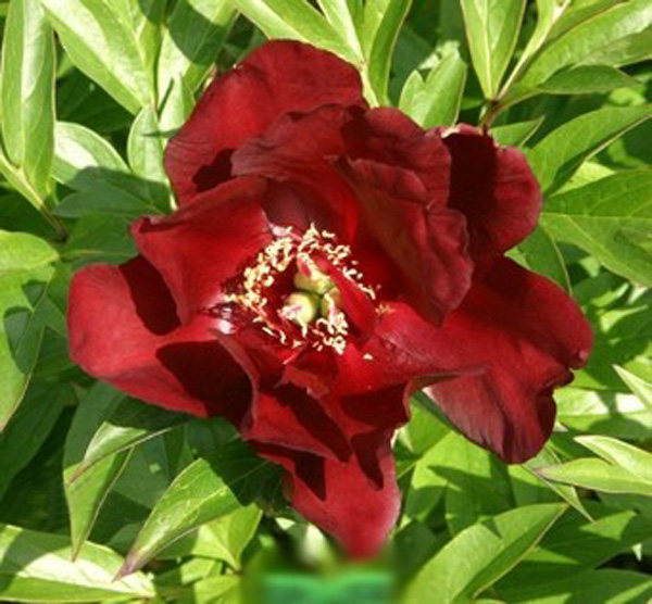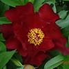 Цветок полумахровый, вишнево-красный, светлее в центре с ярко-желтыми тычинками. Диаметр цветка 20 см., высота куста 85 см. Листьья плотные темно-зелёные. |