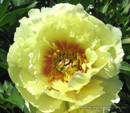 Цветок полумахровый, лимонно-желтого цвета с красно-оранжевым пятном в центре. Диаметр цветка 18 см., высота куста 80 см. Стебли длинные и прочные. Листья темно-зеленые, плотные. |